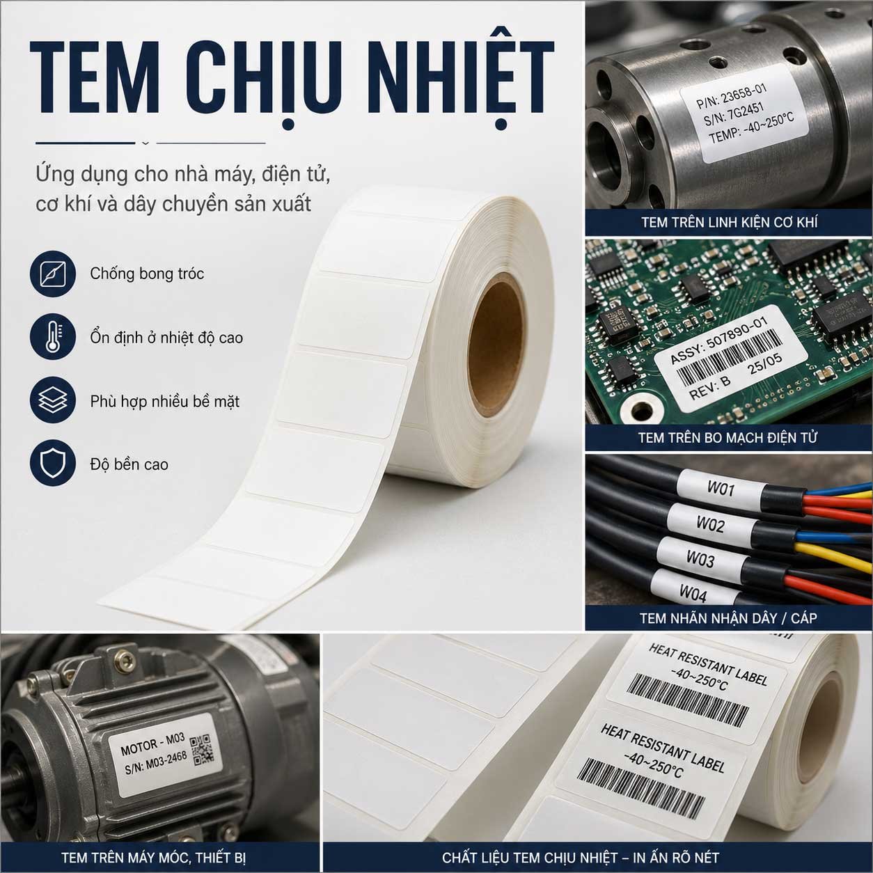 Dùng cho tem nhãn cần độ bền cao hơn giấy, chịu ẩm, chịu ma sát và ổn định trên bề mặt nhựa, kim loại hoặc bao bì công nghiệp.